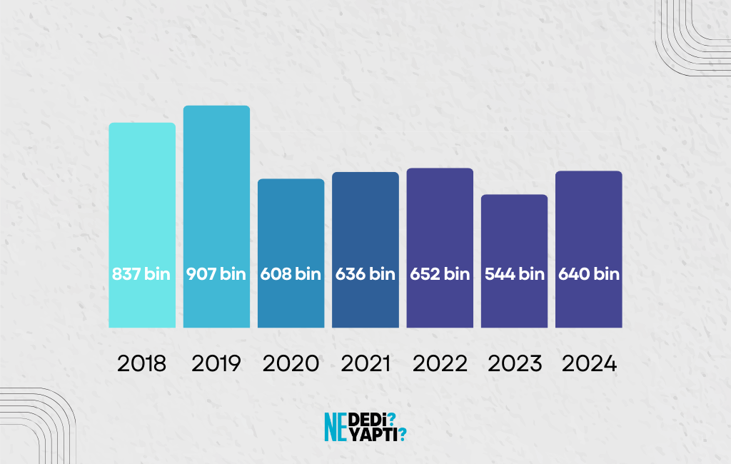 Son yıllarda yıllık konut üretimi, talebe cevap vermekten çok uzak durumda. Merkez Bankası’nın ilgili raporu, yıllık ihtiyacın 800 bin olduğuna işaret ediyor. 2018 yılında 837 bin, 2019’da ise 907 bin yıllık konut üretiminin gerçekleştiği Türkiye’de bu sayılar çeşitli gelişmeler neticesinde giderek ihtiyaca cevap vermekten uzaklaştı. 2025 yılının ilk yarısında sadece 280 bin konut üretimi gerçekleşti. 2018’den 2024’e dek yıllık üretim verileri tabloya şu şekilde yansıyor: