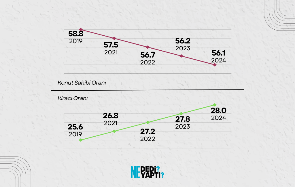 Yüksek konut ve kira enflasyonu, vatandaşların konut sahibi olmasının önünde büyük bir engel durumunda. Konut sahibi oranı 5 yıl içerisinde yüzde 58.8’den 56.1’e gerilerken aynı zaman dilimi içerisinde yüzde 25.6 olan kiracı oranı, yüzde 28’e yükseldi.